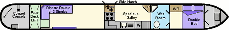 Cruiser stern. Fitted with a wheelchair ramp for access on and off; lift ramp from the stern in to the interior of the boat; accessible saloon, galley and cabin. Rear door entry width is 68cm. Special control console means that you can steer either with a tiller or with a wheel. Higher rear deck to aid with observation and low gunnels, which means the windows are lower inside for better viewing. 240v electrical supply via 3000 watt inverter charger with 3-pin sockets. A hairdryer is also supplied on-board. Radiator central heating.