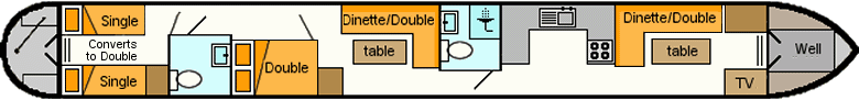 Dashwood is a 67ft Narrowboat sleeping up to 8. This holiday starts from Rugby in Warwickshire. Two dinette seating areas, both can be used as make-up double beds in the evening, if required. A TV/DVD is provided for your entertainment.