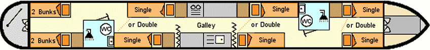Cabins: Two cabins. The rear cabin has two sets of bunk beds (4 singles total). The forward cabin has a flexible layout and can either be configured as two singles or a make-up double bed. Bed linen is supplied.